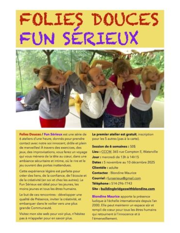 Blondine is also available for hire for an hour, for a morning, an afternoon, or a day of Serious Fun. This light hearted experience is perfect for team building in business, men and women’s groups and any organisation that wishes to lighten up its environment and interactions. These games and exercises do create connection, trust, listening and creativity (in oneself and others). Serious Fun is great for Students, Teachers and all Human Beings alike.